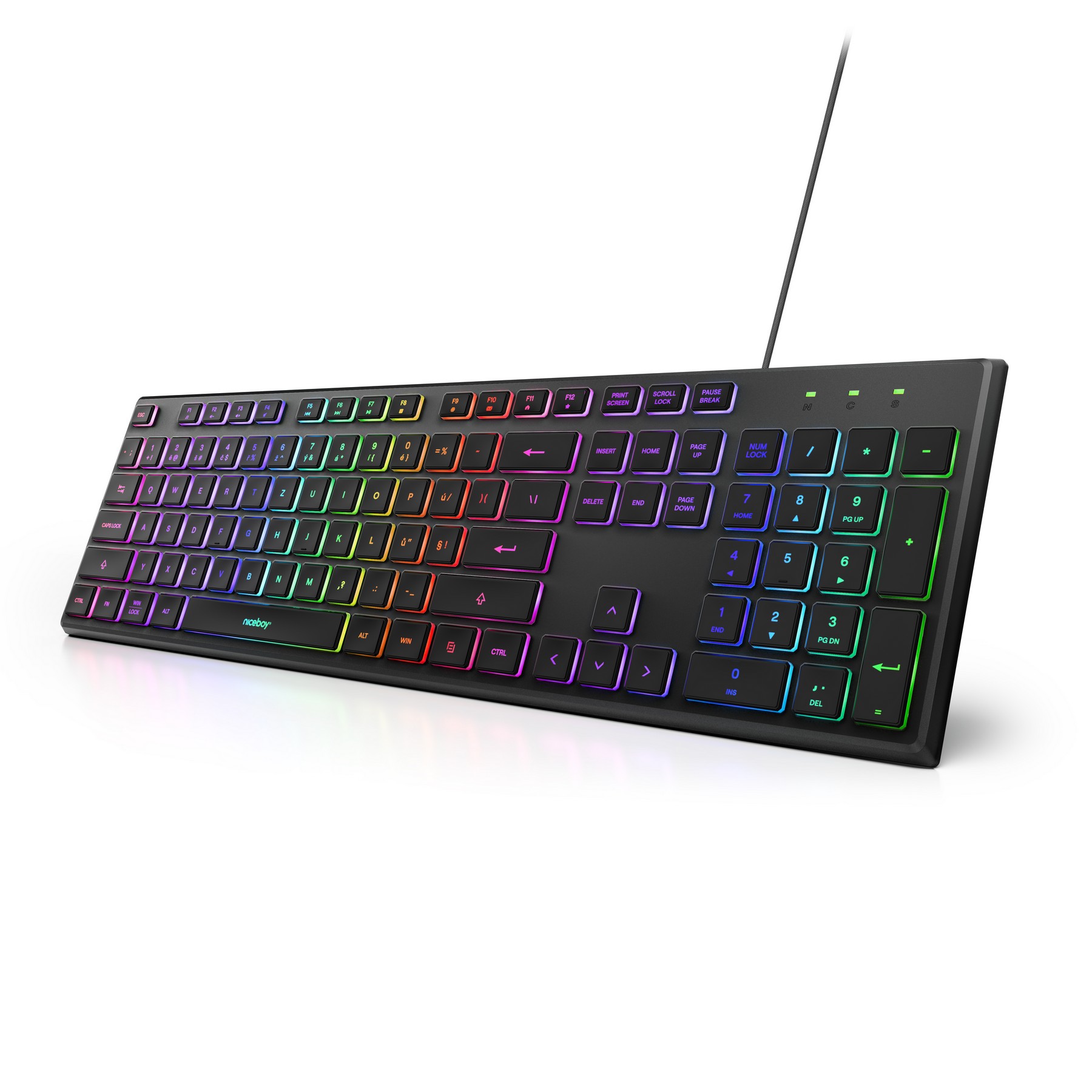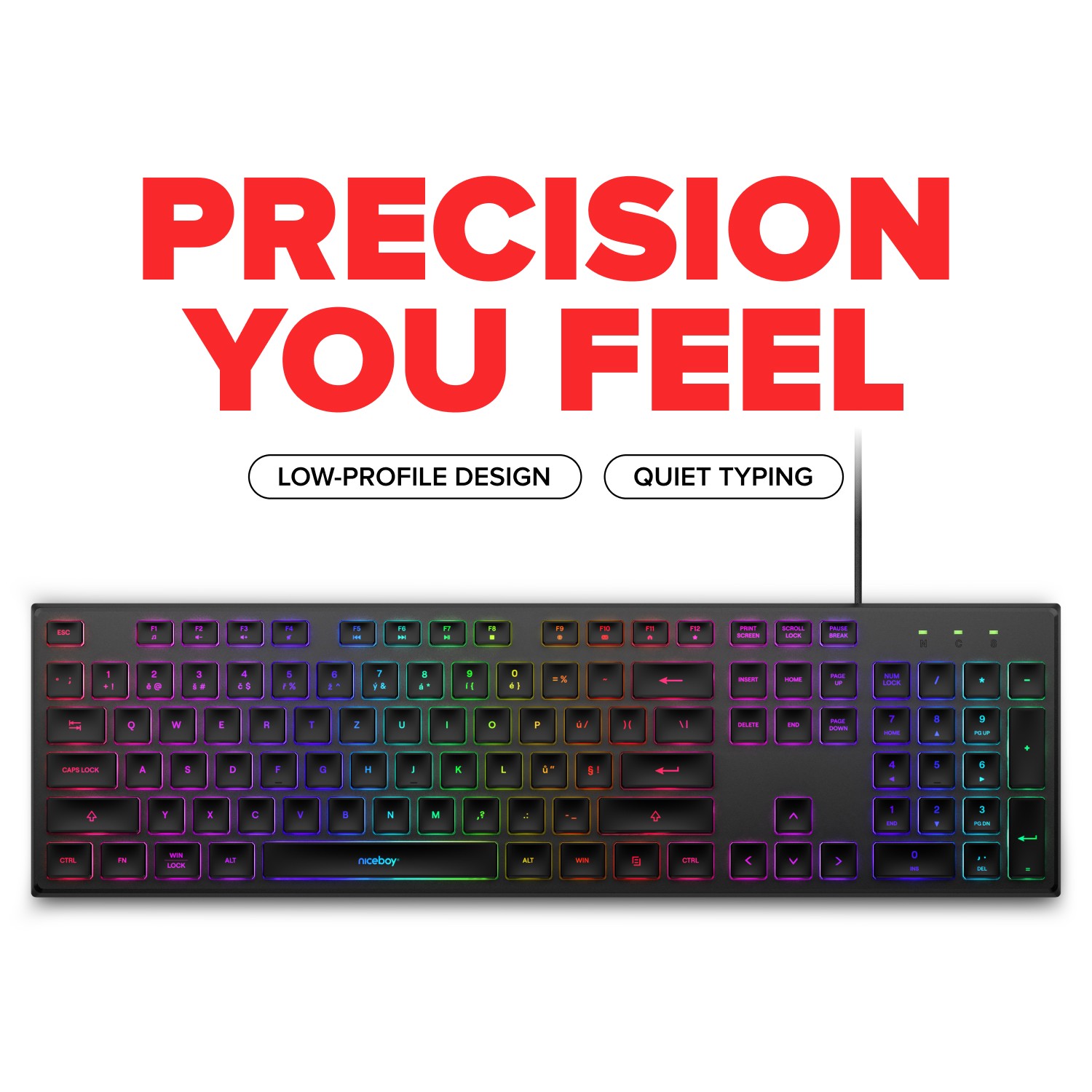 The low-profile gaming keyboard Niceboy K110 will become your secret weapon. During the day, it helps you with school and work. At night, it’s ready for serious gaming. RGB backlighting guides you even in complete darkness. Just plug it into your PC with the cable and start taking down enemies right away.